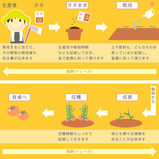 各地で牛肉などをはじめとする偽装事件が相次いだ事は知られていると思います。 安心して皆様に野菜を食べて頂くためには、農作物を栽培している現場を少しでも皆様に知って頂き、 農作物の生産者や生産地・生産時期・生産方法などの栽培開始から収穫・出荷までの様々な情報を追跡(トレ-ス)することができるものです。